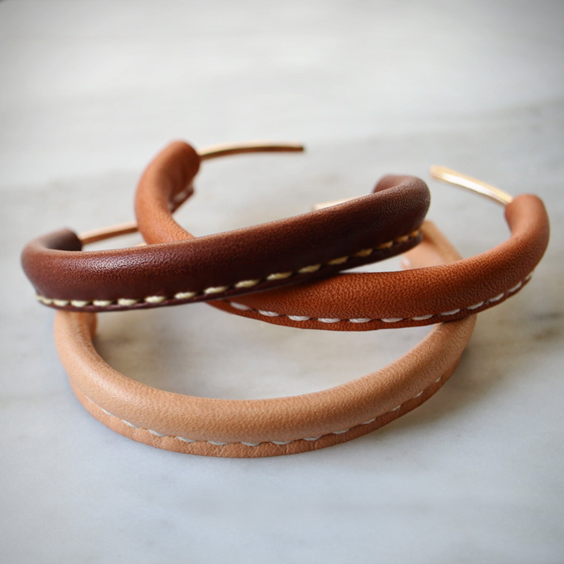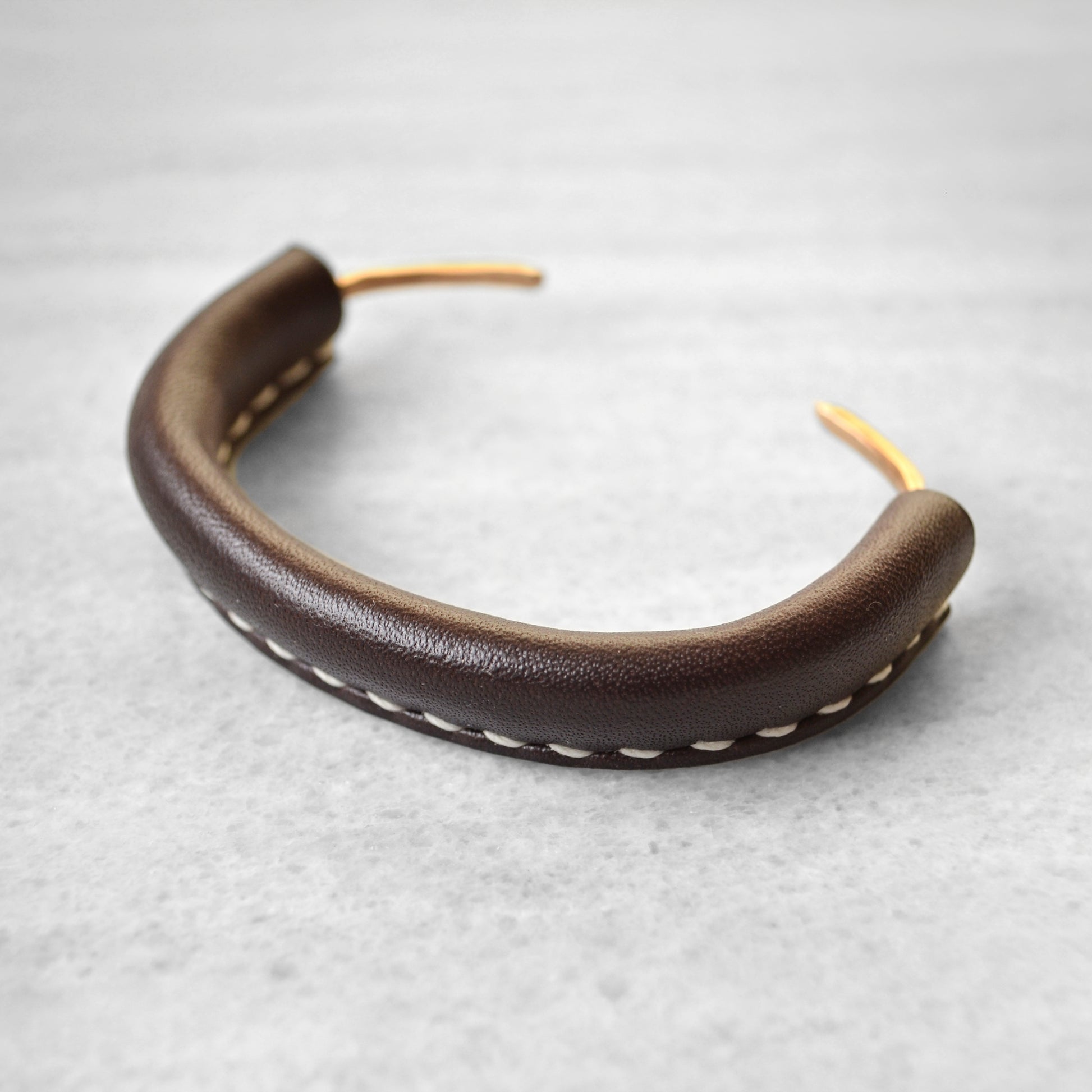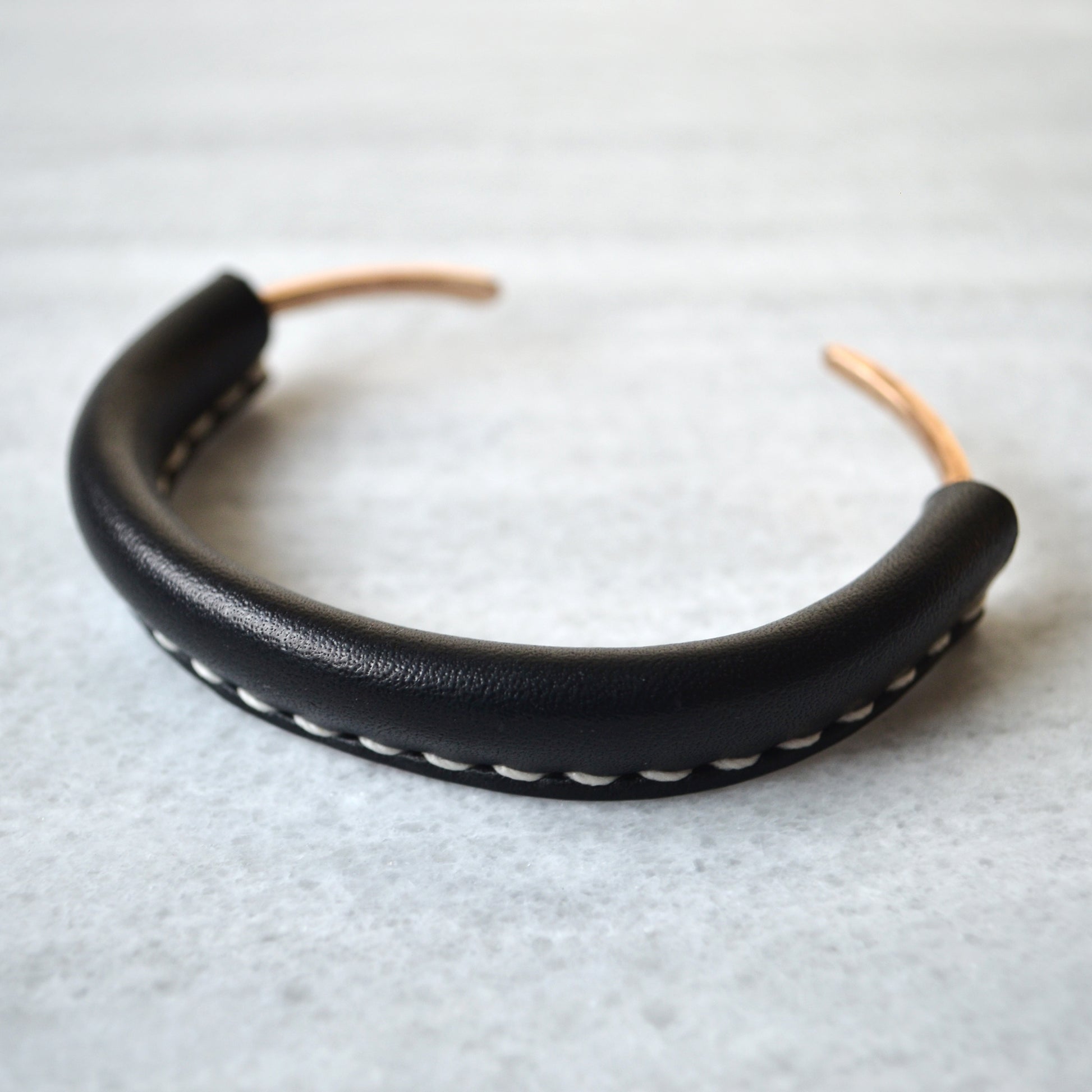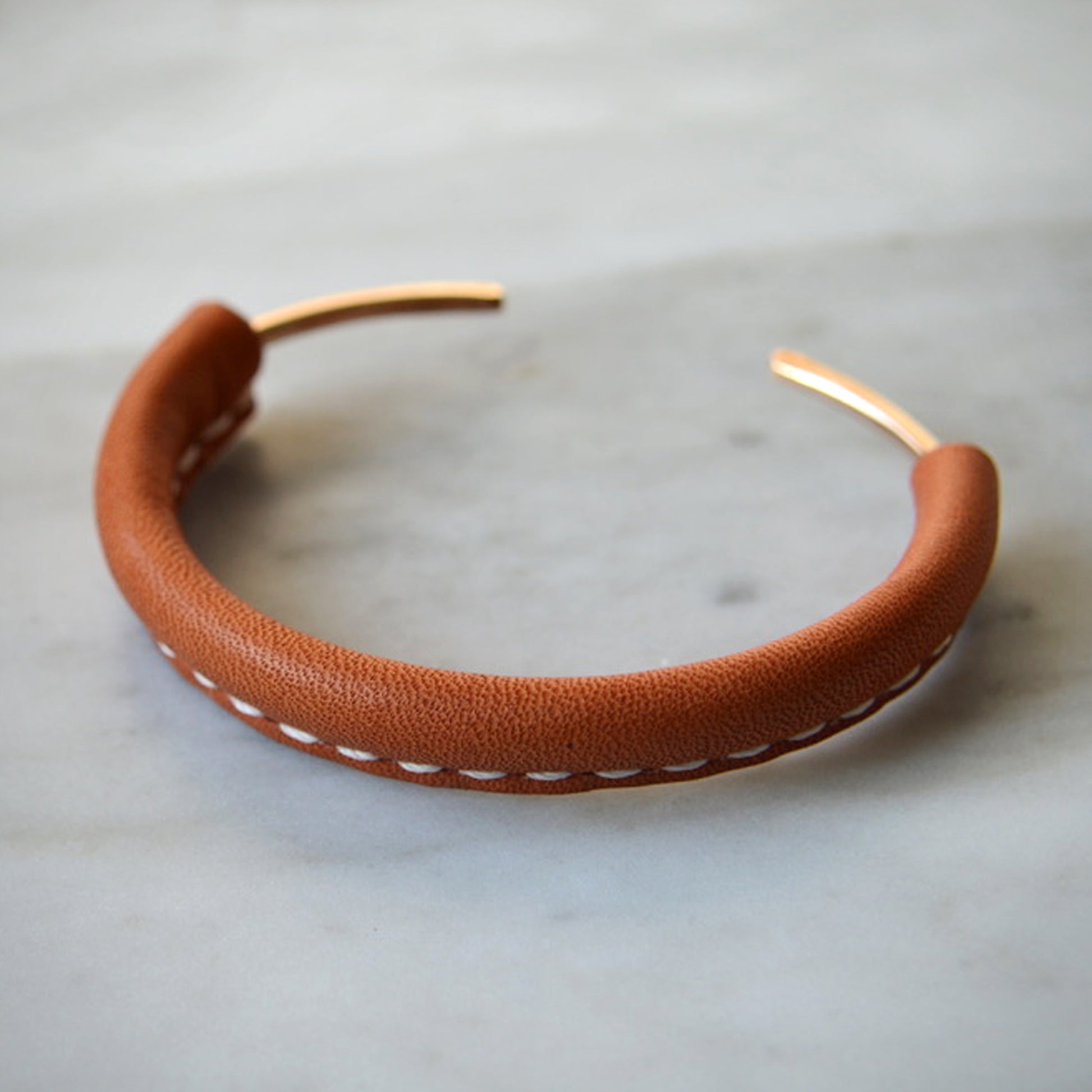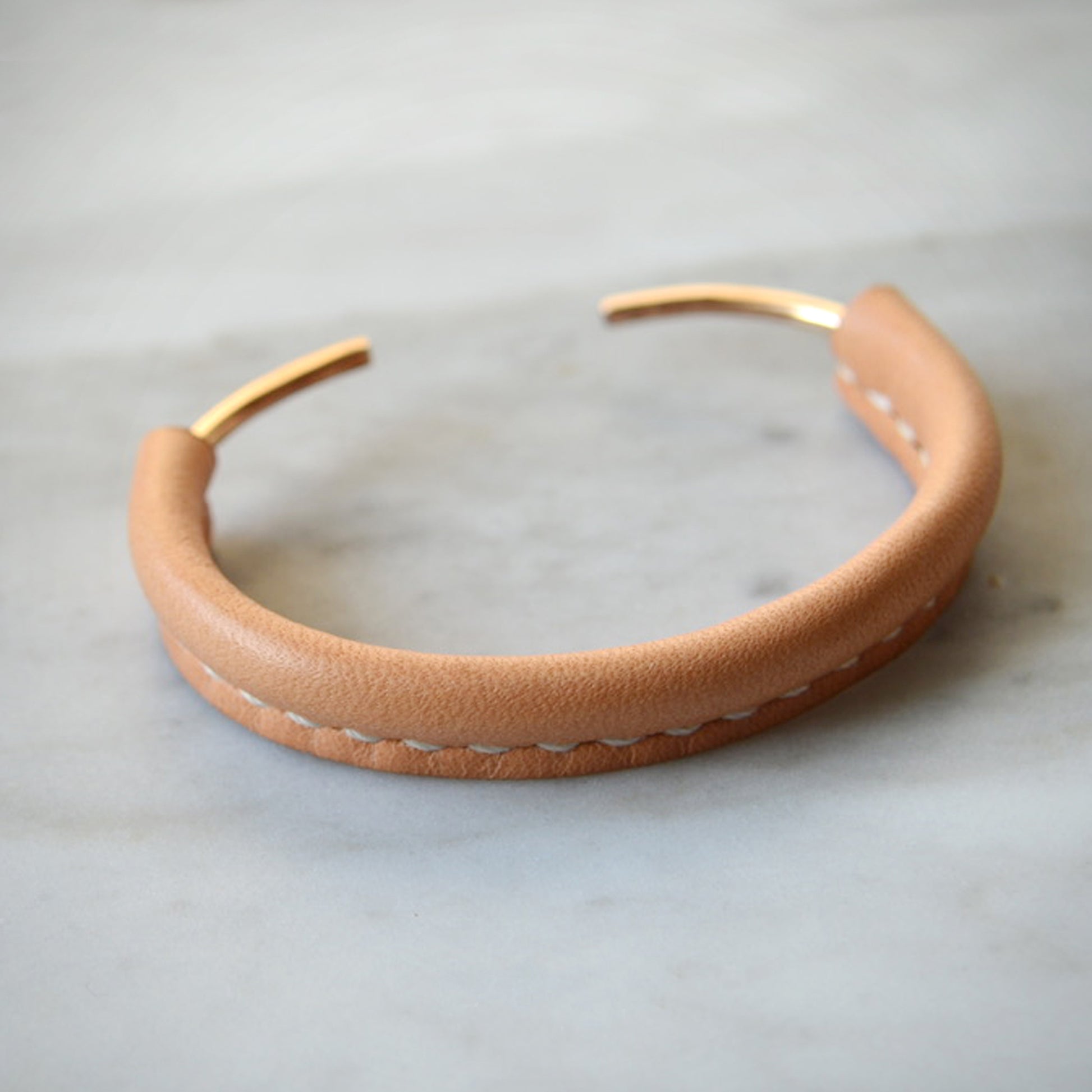 • A simple slip of hand-stitched leather on a hammered bronze cuff